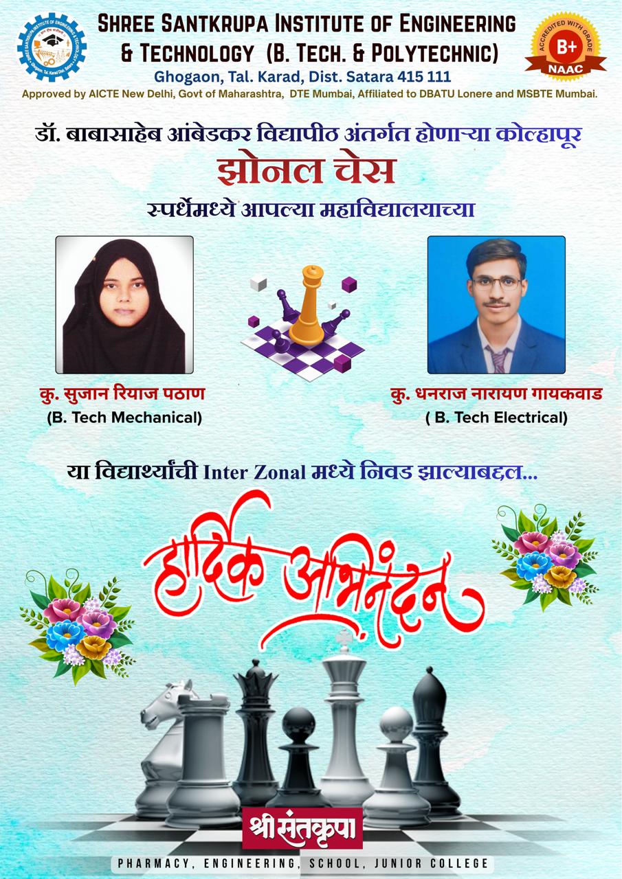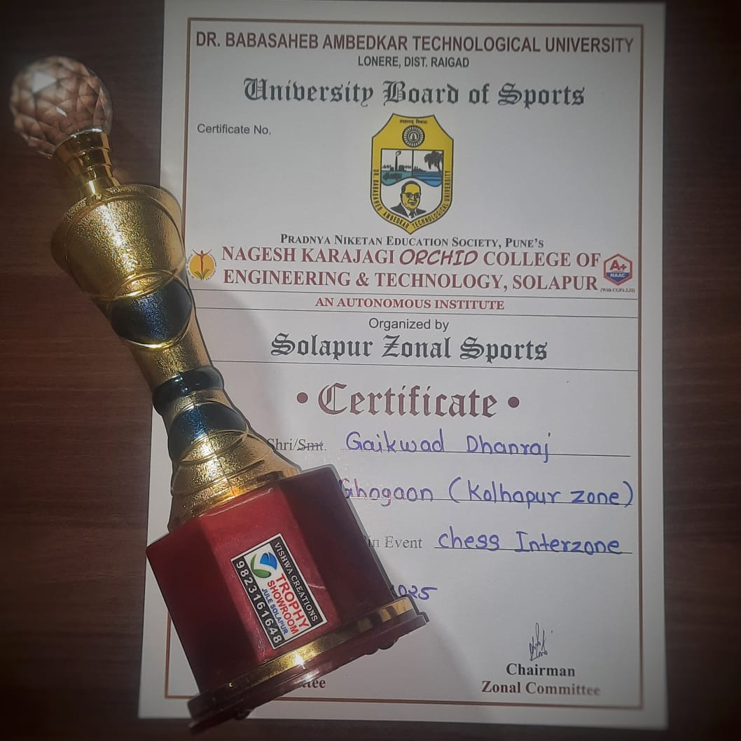 | 24.Mr.Dhanraj Narayan Gaikwad student of Final Year Electrical got second rank in ZONAL Chess competition held at solapur.Dated 22/11/2025. |